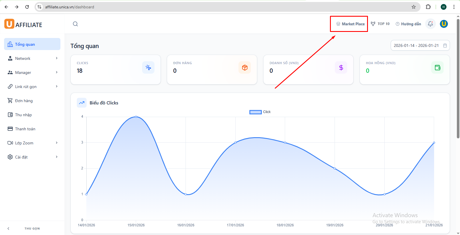 Để lấy link chia sẻ bạn truy cập vào mục Market Place phía trên góc phải, https://affiliate.unica.vn/market-place