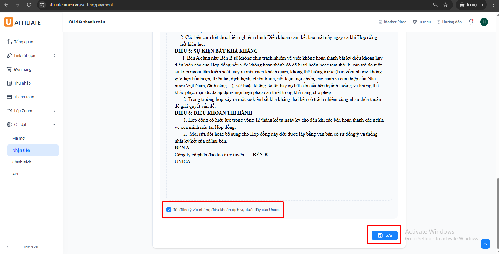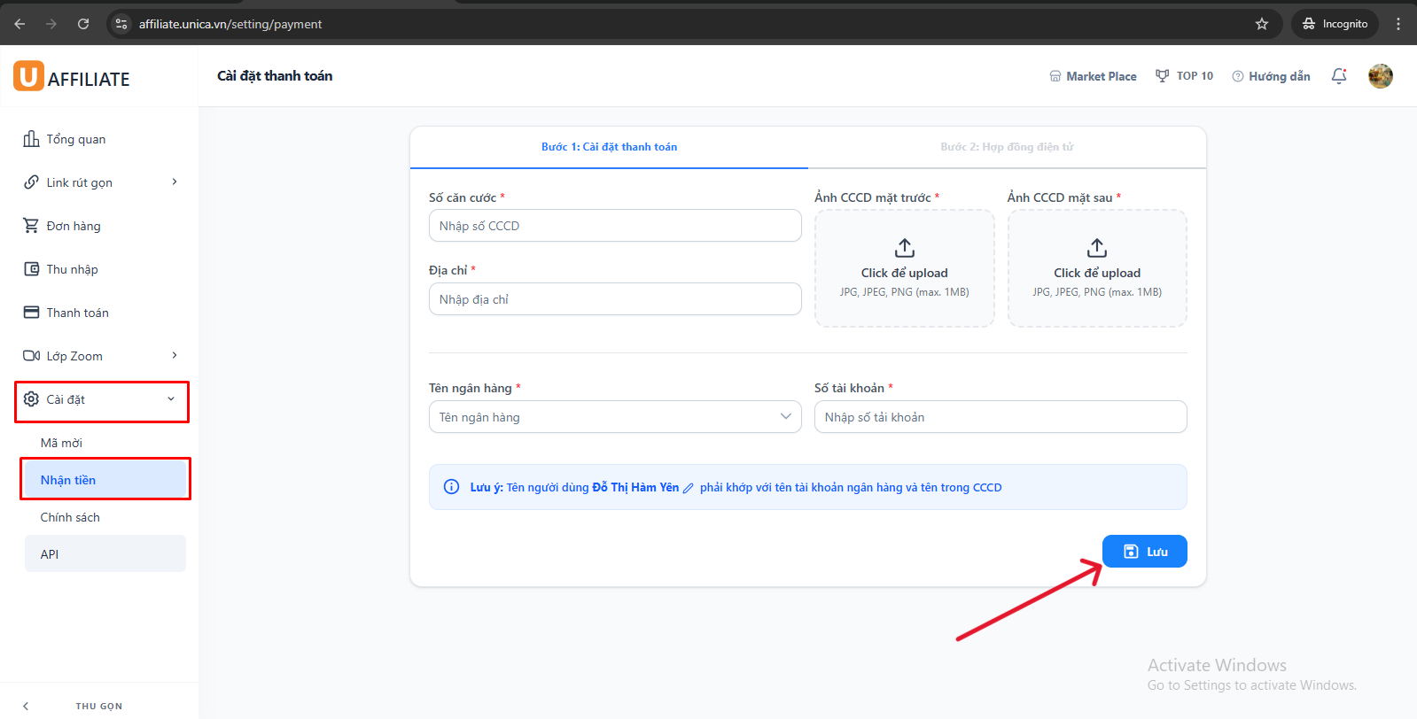 Bạn truy cập https://affiliate.unica.vn/setting/payment