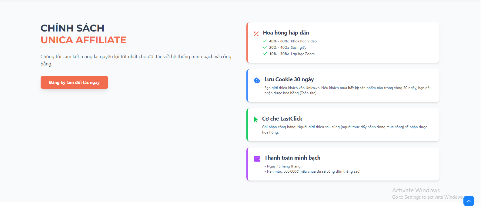 Lưu Cookie trong 30 ngày: Bạn giới thiệu khách vào Unica.vn. Nếu khách mua bất kỳ sản phẩm nào trong vòng 30 ngày, bạn đều nhận được hoa hồng (Toàn site).