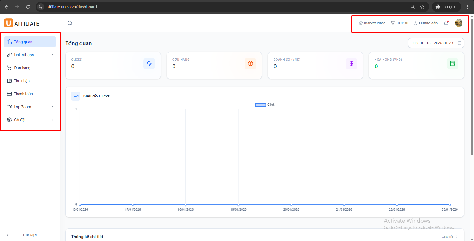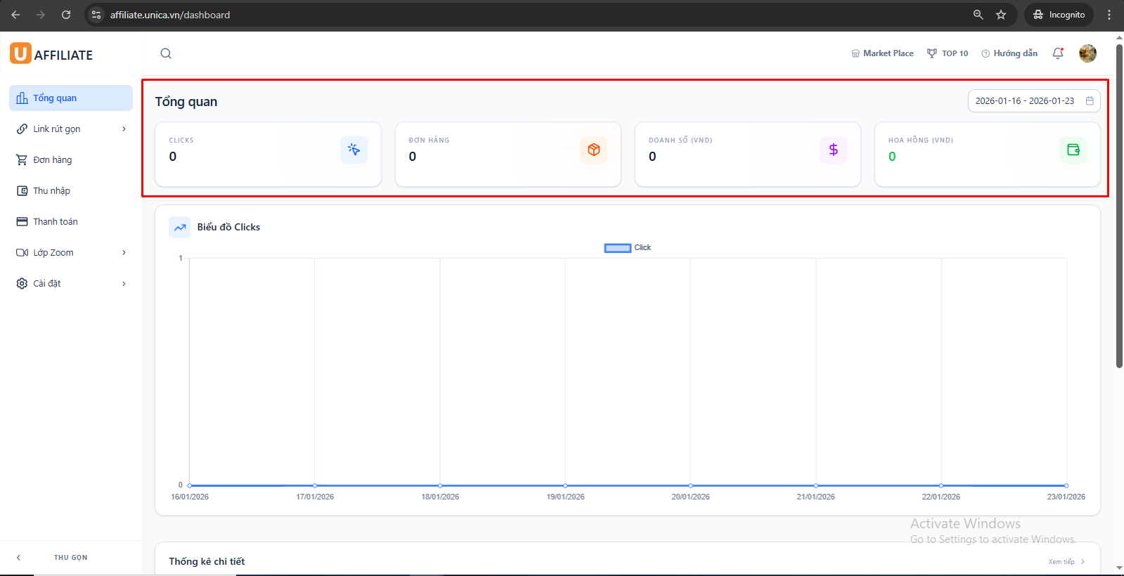 Trang Tổng quan – Dashboard Affiliate Unica là nơi giúp bạn theo dõi toàn bộ hiệu quả hoạt động Affiliate của mình một cách nhanh chóng và trực quan nhất.