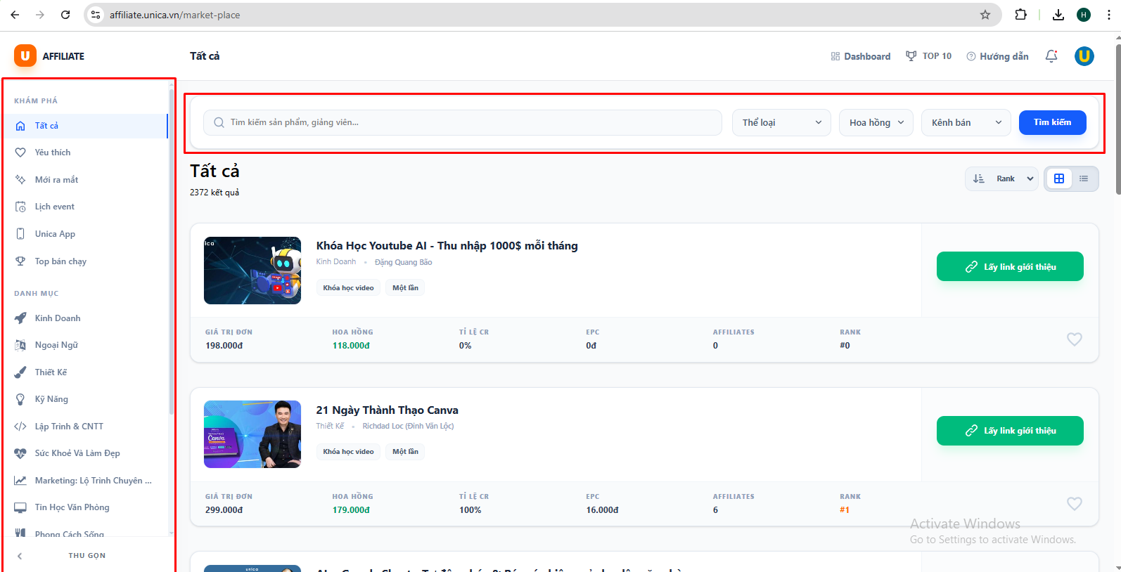 Phía trên thanh ngang sẽ hiện Ô tìm kiếm theo sản phẩm, giảng viên..., Các bộ lọc theo thể loại, hoa hồng, kênh bán